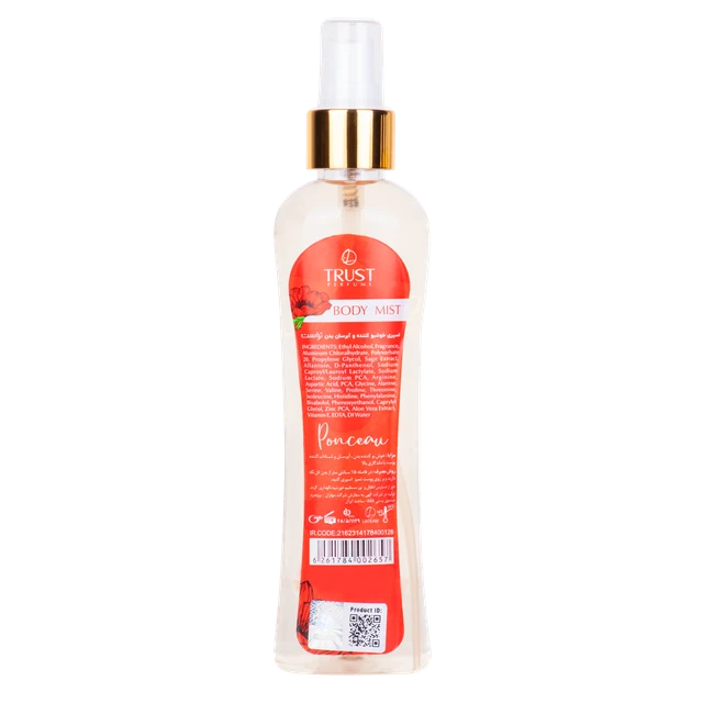 با رایحه گلی-میوهای بادی میست زنانه تراست مدل Ponceau، طراوت و تازگی را روی نبض خود احساس کنید. این محصول، بانوان با اعتماد به نفسی را هدف قرار میدهد که مایلند رایحهای جذاب و جدید را امتحان کنند. در ابتدا رایحه انار، هلو و سیب را پراکنده میکند که با عطر گل همیشه بهار و پئونی تلفیق شده است. در نهایت رایحه وانیل، مارشملو و چوب بلوط را روی پوست باقی میگذارد.